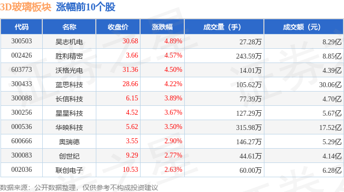 证券之星消息,12月1日3D玻璃板块较上一交易日上涨1.89%,昊志机电领涨。当日上证指数报收于3914.01,上涨0.65%。深证成指报收于13146.72,上涨1.25%。3D玻璃板块个股涨跌见下表: