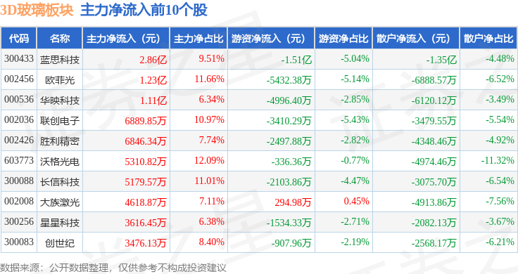 从资金流向上来看,当日3D玻璃板块主力资金净流入9.17亿元,游资资金净流出4.41亿元,散户资金净流出4.76亿元。3D玻璃板块个股资金流向见下表: