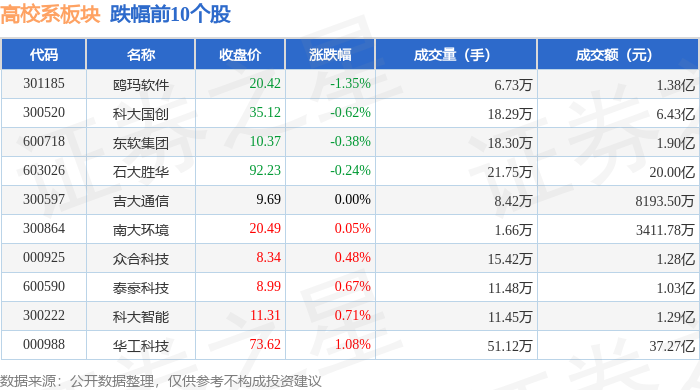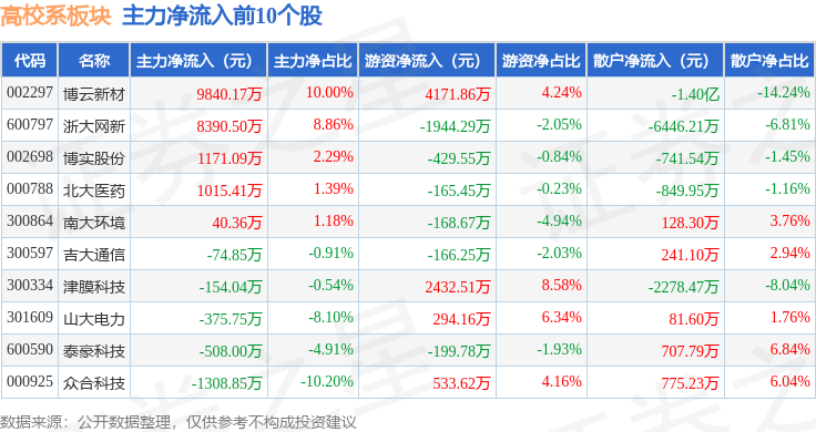 从资金流向上来看,当日高校系板块主力资金净流出1.94亿元,游资资金净流入1.47亿元,散户资金净流入4695.79万元。高校系板块个股资金流向见下表:
