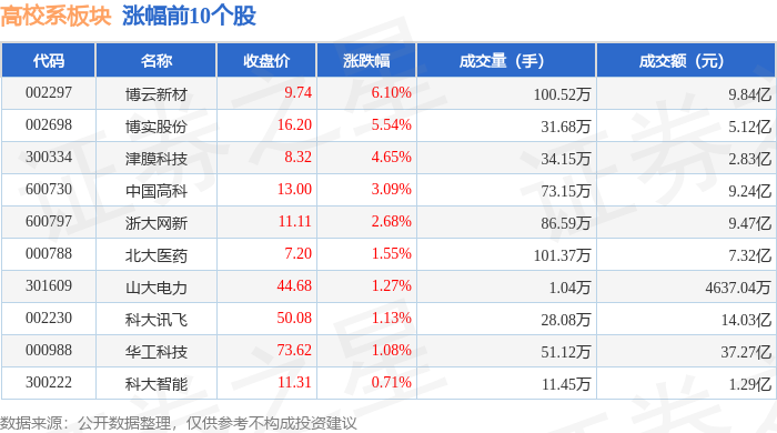 证券之星消息,12月1日高校系板块较上一交易日上涨1.25%,博云新材领涨。当日上证指数报收于3914.01,上涨0.65%。深证成指报收于13146.72,上涨1.25%。高校系板块个股涨跌见下表: