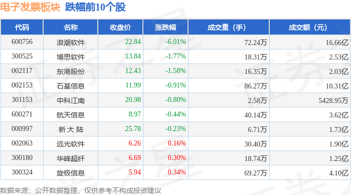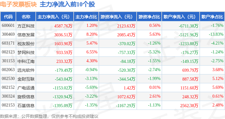 从资金流向上来看,当日电子发票板块主力资金净流出2.31亿元,游资资金净流入9627.51万元,散户资金净流入1.35亿元。电子发票板块个股资金流向见下表: