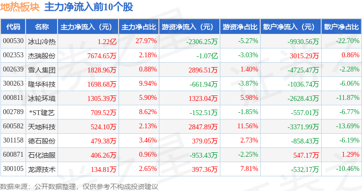 从资金流向上来看,当日地热板块主力资金净流入1.75亿元,游资资金净流出9625.51万元,散户资金净流出7886.49万元。地热板块个股资金流向见下表: