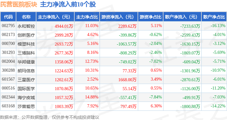 从资金流向上来看,当日民营医院板块主力资金净流出3.94亿元,游资资金净流入1.43亿元,散户资金净流入2.51亿元。民营医院板块个股资金流向见下表: