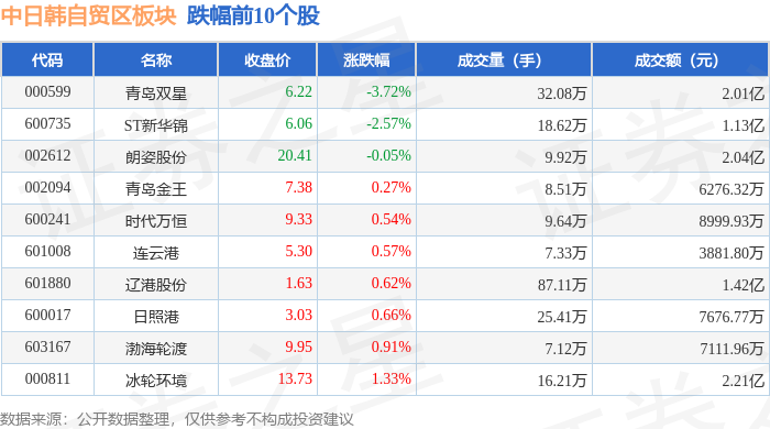 从资金流向上来看,当日中日韩自贸区板块主力资金净流入3.51亿元,游资资金净流入2.19亿元,散户资金净流出5.69亿元。中日韩自贸区板块个股资金流向见下表: