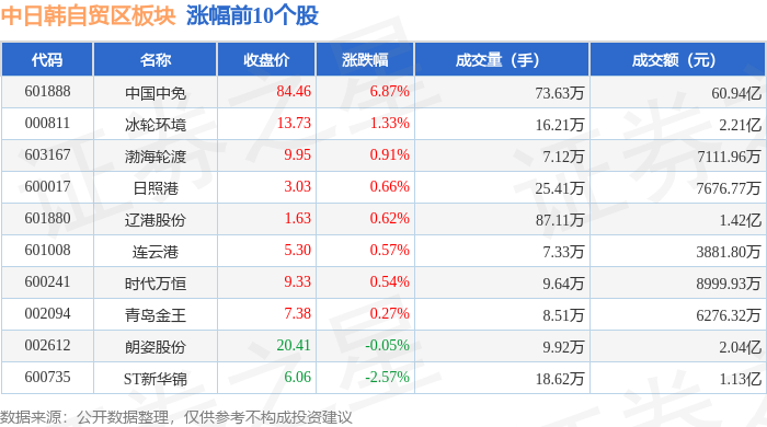 证券之星消息,12月1日中日韩自贸区板块较上一交易日上涨4.55%,中国中免领涨。当日上证指数报收于3914.01,上涨0.65%。深证成指报收于13146.72,上涨1.25%。中日韩自贸区板块个股涨跌见下表: