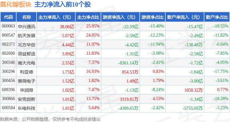 从资金流向上来看,当日氮化镓板块主力资金净流入39.8亿元,游资资金净流出24.78亿元,散户资金净流出15.02亿元。氮化镓板块个股资金流向见下表:
