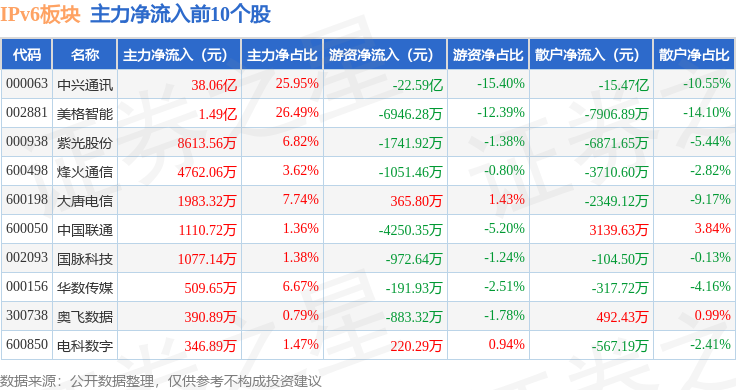 从资金流向上来看,当日IPv6板块主力资金净流入37.06亿元,游资资金净流出22.33亿元,散户资金净流出14.73亿元。IPv6板块个股资金流向见下表: