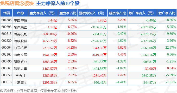 从资金流向上来看,当日免税店概念板块主力资金净流入1.01亿元,游资资金净流入4.01亿元,散户资金净流出5.02亿元。免税店概念板块个股资金流向见下表:
