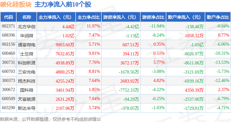 从资金流向上来看,当日碳化硅板块主力资金净流入2.18亿元,游资资金净流出3.54亿元,散户资金净流入1.36亿元。碳化硅板块个股资金流向见下表: