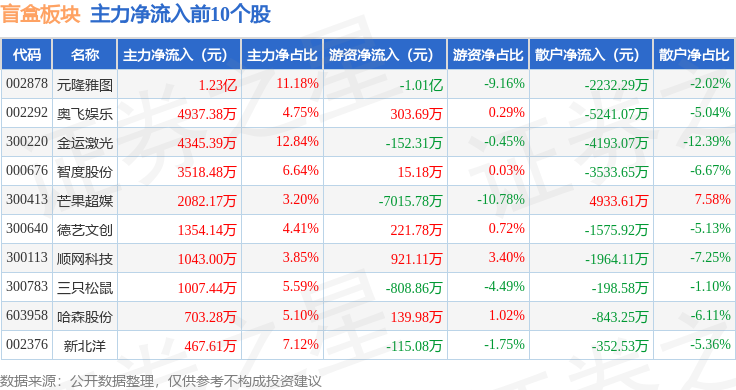 从资金流向上来看,当日盲盒板块主力资金净流入2356.61万元,游资资金净流出171.15万元,散户资金净流出2185.47万元。盲盒板块个股资金流向见下表: