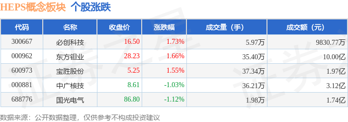 证券之星消息,12月1日HEPS概念板块较上一交易日上涨0.51%,必创科技领涨。当日上证指数报收于3914.01,上涨0.65%。深证成指报收于13146.72,上涨1.25%。HEPS概念板块个股涨跌见下表: