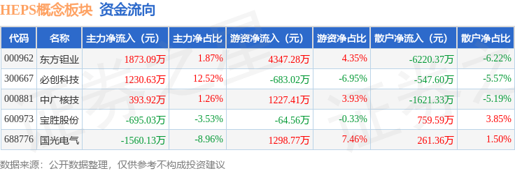 从资金流向上来看,当日HEPS概念板块主力资金净流入1242.47万元,游资资金净流入6125.89万元,散户资金净流出7368.36万元。HEPS概念板块个股资金流向见下表: