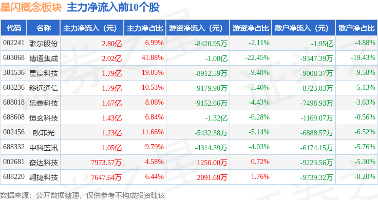 从资金流向上来看,当日星闪概念板块主力资金净流入14.98亿元,游资资金净流出5.71亿元,散户资金净流出9.27亿元。星闪概念板块个股资金流向见下表: