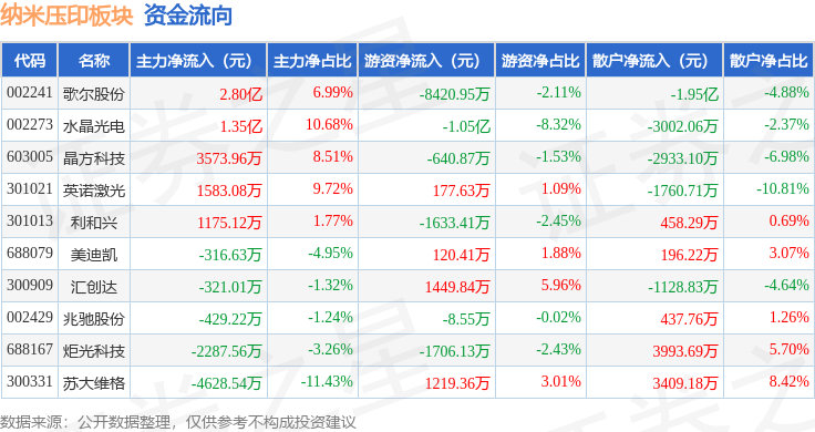 从资金流向上来看,当日纳米压印板块主力资金净流入3.98亿元,游资资金净流出2.0亿元,散户资金净流出1.99亿元。纳米压印板块个股资金流向见下表: