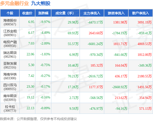 个股表现方面,多元金融行业当日领跌股为海德股份(000567),该股当日报收6.95,下跌9.97%,成交量29.98万,主力资金净流出4473.17万元。江苏金租(600901)以下跌4.49%紧随其后,该股当日成交量69.93万,主力资金净流入2643.6万元。除此之外,电投产融(000958)、瑞达期货(002961)、亚联发展(002316)均进入当日熊股之列。具体个股列表见下表: