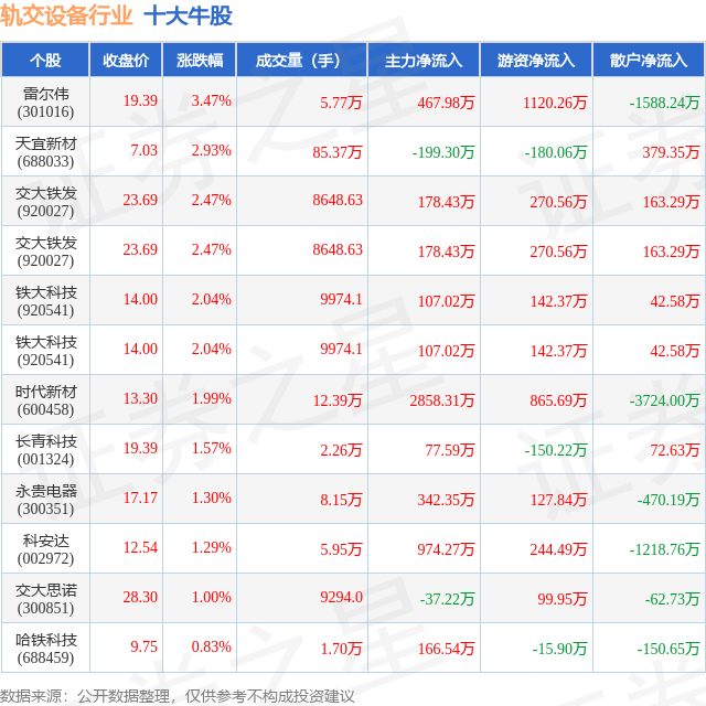 个股表现方面,轨交设备行业当日领涨股为雷尔伟(301016),该股当日报收19.39,上涨3.47%,成交量5.77万,主力资金净流入467.98万元。天宜新材(688033)以上涨2.93%紧随其后,该股当日成交量85.37万,主力资金净流出199.3万元。除此之外,交大铁发(920027)、交大铁发(920027)、铁大科技(920541)均进入当日牛股之列。具体个股列表见下表: