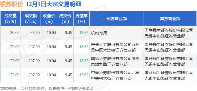 证券之星消息,12月1日银邦股份发生大宗交易,交易数据如下: