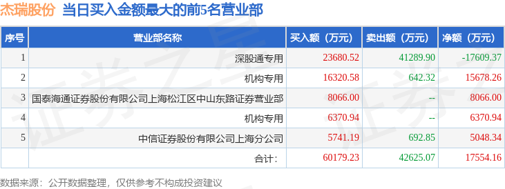 证券之星消息,沪深交易所2025年12月1日公布的交易公开信息显示,杰瑞股份(002353)因日涨幅偏离值达到7%的前5只证券登上龙虎榜。此次是近5个交易日内第1次上榜。