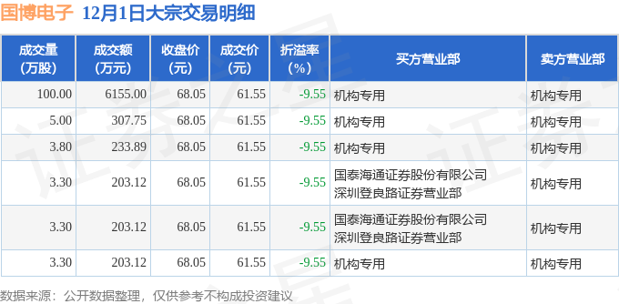 证券之星消息,12月1日国博电子发生大宗交易,交易数据如下: