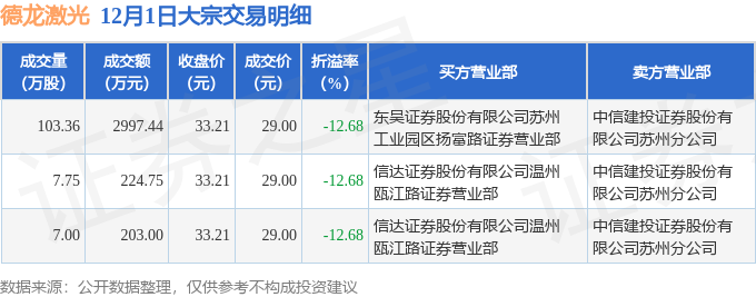 证券之星消息,12月1日德龙激光发生大宗交易,交易数据如下: