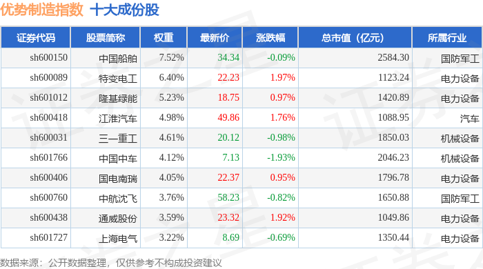 证券之星消息,12月1日,优势制造(000146)指数报收于7490.34点,涨0.53%,成交482.51亿元,换手率1.32%。当日该指数成份股中,上涨的有31家,中创智领以5.54%的涨幅领涨,下跌的有18家,阿特斯以6.92%的跌幅领跌。