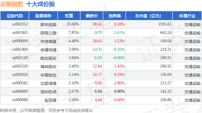 运输指数(399237)十大成份股详情如下: