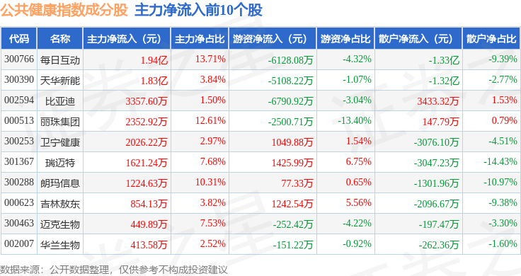 资金流向方面,公共健康(399277)指数成份股当日主力资金净流出合计2.91亿元,游资资金净流入合计1.83亿元,散户资金净流入合计1.07亿元。成份股资金流向详情见下表: