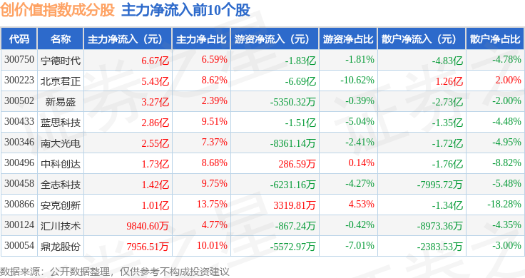 资金流向方面,创价值(399295)指数成份股当日主力资金净流入合计4612.49万元,游资资金净流入合计8512.03万元,散户资金净流出合计1.31亿元。成份股资金流向详情见下表: