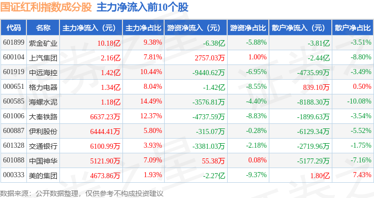 资金流向方面,国证红利(399321)指数成份股当日主力资金净流出合计4.05亿元,游资资金净流出合计5.61亿元,散户资金净流入合计9.66亿元。成份股资金流向详情见下表: