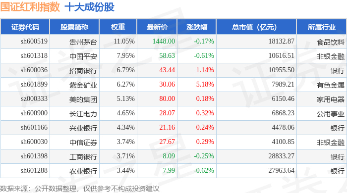 证券之星消息,12月1日,国证红利(399321)指数报收于7738.63点,涨0.64%,成交699.59亿元,换手率0.29%。当日该指数成份股中,上涨的有36家,紫金矿业以5.18%的涨幅领涨,下跌的有13家,万科A以3.35%的跌幅领跌。