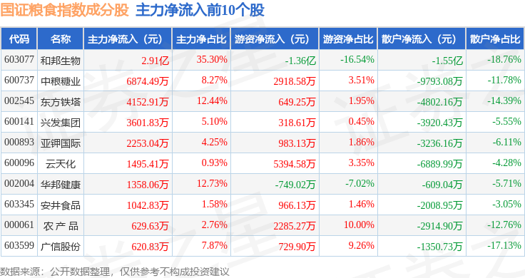 资金流向方面,国证粮食(399365)指数成份股当日主力资金净流出合计2.35亿元,游资资金净流入合计1.57亿元,散户资金净流入合计7770.83万元。成份股资金流向详情见下表: