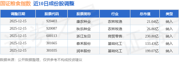 近10日内国证粮食(399365)指数成份股做了调整,新纳入了5只股票。