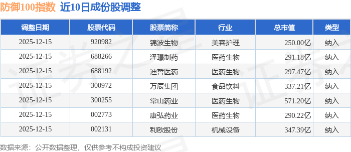 近10日内防御100(399403)指数成份股做了调整,新纳入了7只股票。