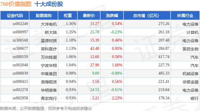 证券之星消息,12月1日,700价值(399629)指数报收于2856.12点,涨0.81%,成交514.28亿元,换手率1.79%。当日该指数成份股中,上涨的有163家,亚太科技以10.06%的涨幅领涨,下跌的有62家,大中矿业以4.35%的跌幅领跌。