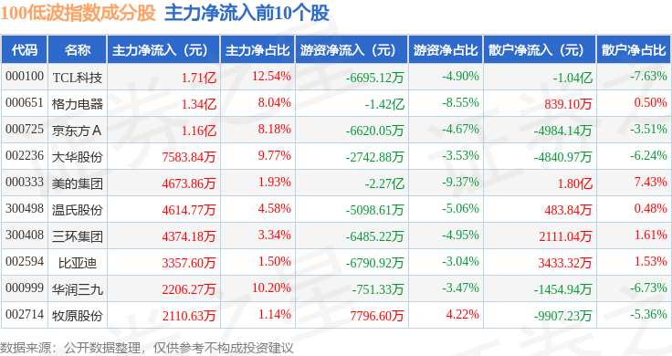 资金流向方面,100低波(399645)指数成份股当日主力资金净流出合计2.37亿元,游资资金净流出合计4.22亿元,散户资金净流入合计6.6亿元。成份股资金流向详情见下表: