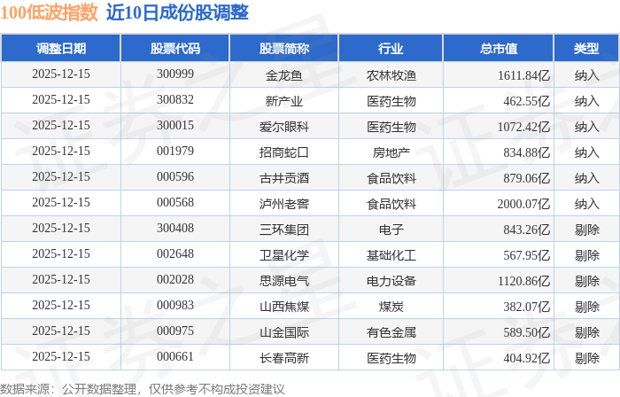 近10日内100低波(399645)指数成份股做了调整,新纳入了6只股票,剔除了6只股票。