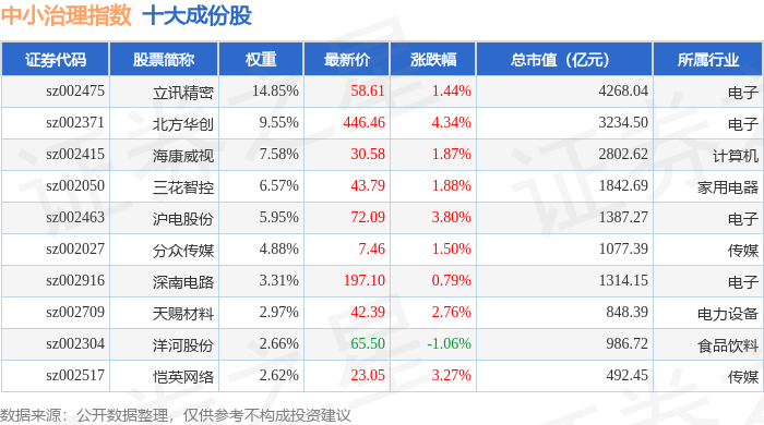 证券之星消息,12月1日,中小治理(399650)指数报收于2554.91点,涨1.89%,成交473.14亿元,换手率1.4%。当日该指数成份股中,上涨的有39家,鹏鼎控股以9.99%的涨幅领涨,下跌的有11家,苏泊尔以2.17%的跌幅领跌。