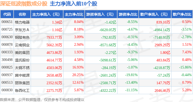 资金流向方面,深证低波(399661)指数成份股当日主力资金净流出合计7.51亿元,游资资金净流出合计1.95亿元,散户资金净流入合计9.46亿元。成份股资金流向详情见下表: