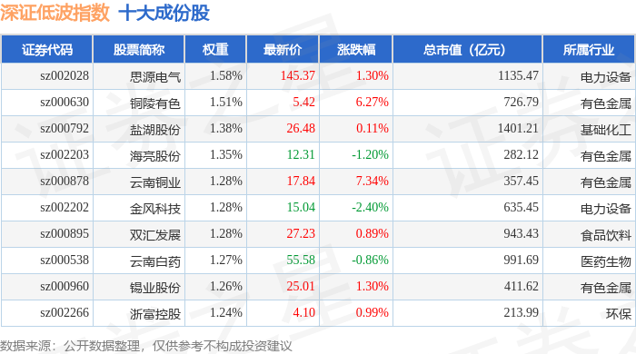 证券之星消息,12月1日,深证低波(399661)指数报收于5877.22点,涨0.59%,成交528.78亿元,换手率0.86%。当日该指数成份股中,上涨的有69家,云南铜业以7.34%的涨幅领涨,下跌的有27家,温氏股份以2.99%的跌幅领跌。