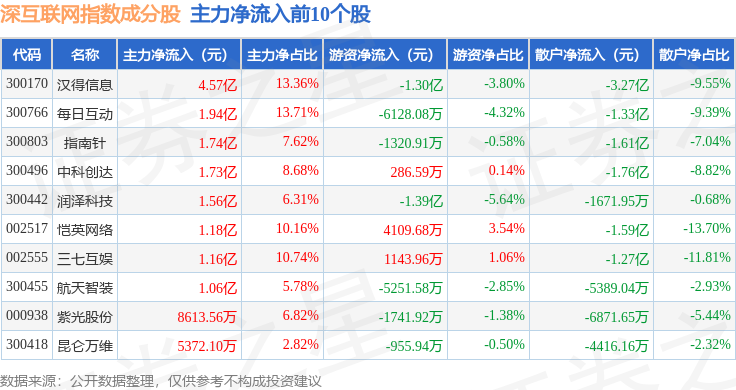 资金流向方面,深互联网(399675)指数成份股当日主力资金净流入合计1.67亿元,游资资金净流入合计1.55亿元,散户资金净流出合计3.22亿元。成份股资金流向详情见下表: