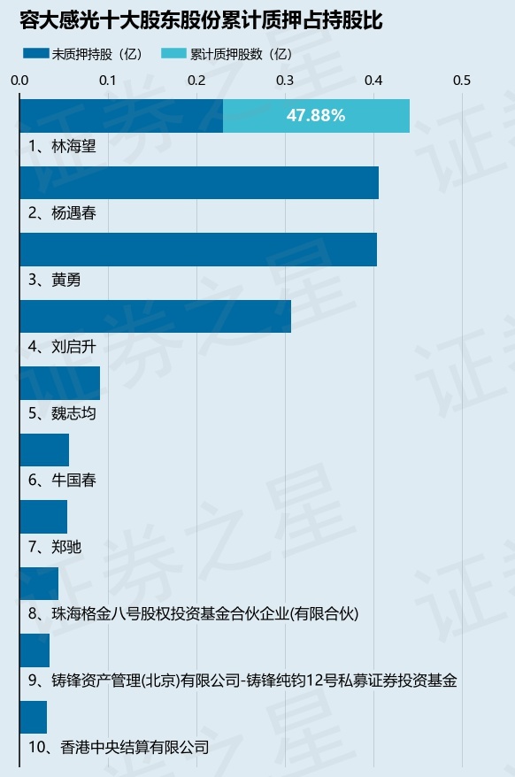 截止本公告日,股东林海望已累计质押股份2112.2万股,占其持股总数的47.88%。本次质押后容大感光十大股东的累计质押股份占持股比例(占持股比例的计算以公司最新一期财务报表公布的十大股东的持股总数为基准)见下图: