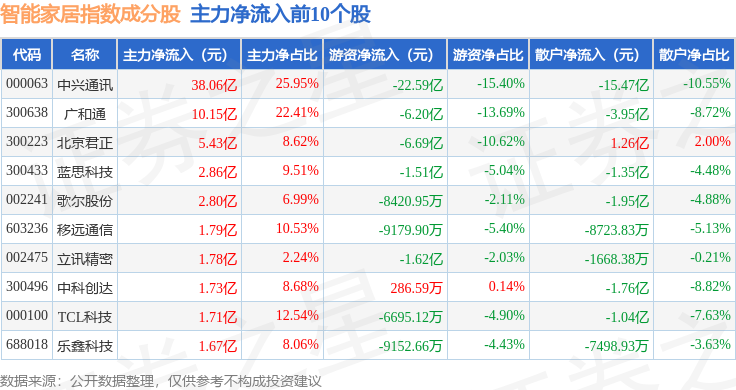 资金流向方面,智能家居(399996)指数成份股当日主力资金净流入合计57.77亿元,游资资金净流出合计45.98亿元,散户资金净流出合计11.79亿元。成份股资金流向详情见下表: