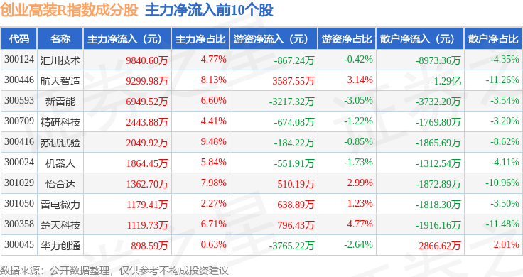 资金流向方面,创业高装R(470040)指数成份股当日主力资金净流出合计7.29亿元,游资资金净流入合计1.19亿元,散户资金净流入合计6.1亿元。成份股资金流向详情见下表: