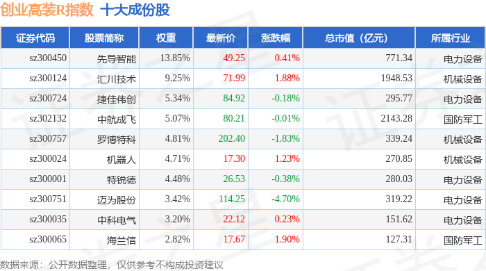 证券之星消息,12月1日,创业高装R(470040)指数报收于4234.45点,涨0.69%,成交268.15亿元,换手率5.1%。当日该指数成份股中,上涨的有32家,航天智造以6.68%的涨幅领涨,下跌的有18家,迈为股份以4.7%的跌幅领跌。