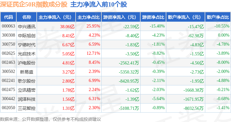 资金流向方面,深证民企50R(470057)指数成份股当日主力资金净流入合计47.79亿元,游资资金净流出合计34.69亿元,散户资金净流出合计13.1亿元。成份股资金流向详情见下表:
