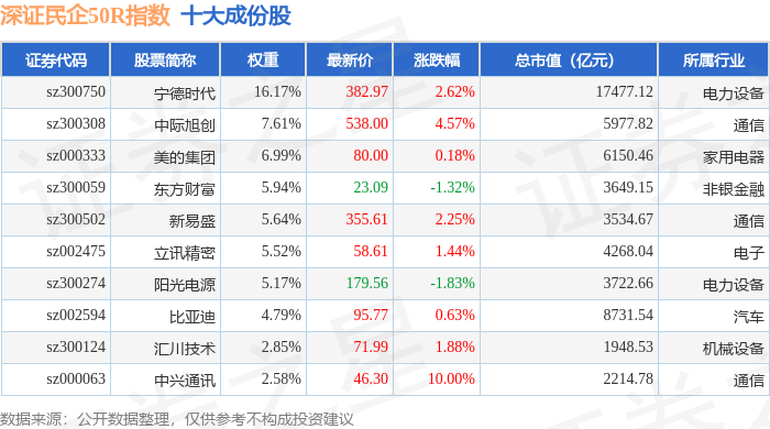 证券之星消息,12月1日,深证民企50R(470057)指数报收于3907.12点,涨1.61%,成交1498.9亿元,换手率1.78%。当日该指数成份股中,上涨的有38家,光启技术以10.01%的涨幅领涨,下跌的有11家,温氏股份以2.99%的跌幅领跌。