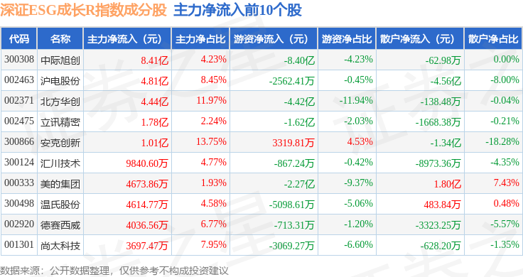 资金流向方面,深证ESG成长R(470060)指数成份股当日主力资金净流出合计13.3亿元,游资资金净流出合计3.27亿元,散户资金净流入合计16.56亿元。成份股资金流向详情见下表: