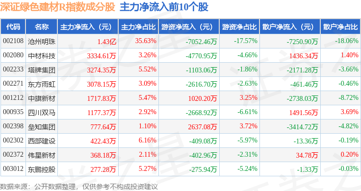 资金流向方面,深证绿色建材R(470077)指数成份股当日主力资金净流入合计1.82亿元,游资资金净流出合计1.11亿元,散户资金净流出合计7159.1万元。成份股资金流向详情见下表: