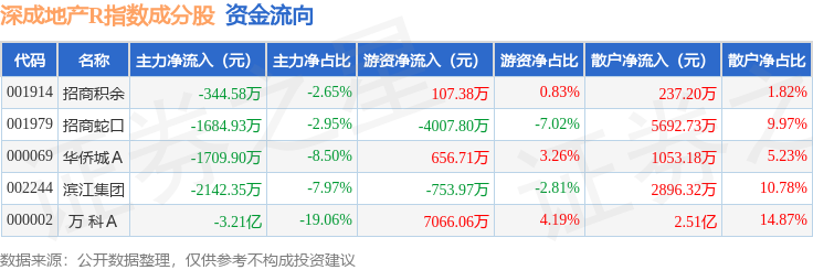资金流向方面,深成地产R(471001)指数成份股当日主力资金净流出合计3.8亿元,游资资金净流入合计3068.38万元,散户资金净流入合计3.49亿元。成份股资金流向详情见下表: