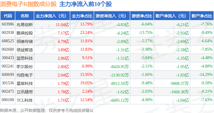 资金流向方面,消费电子R(480030)指数成份股当日主力资金净流入合计34.4亿元,游资资金净流出合计14.6亿元,散户资金净流出合计19.8亿元。成份股资金流向详情见下表: